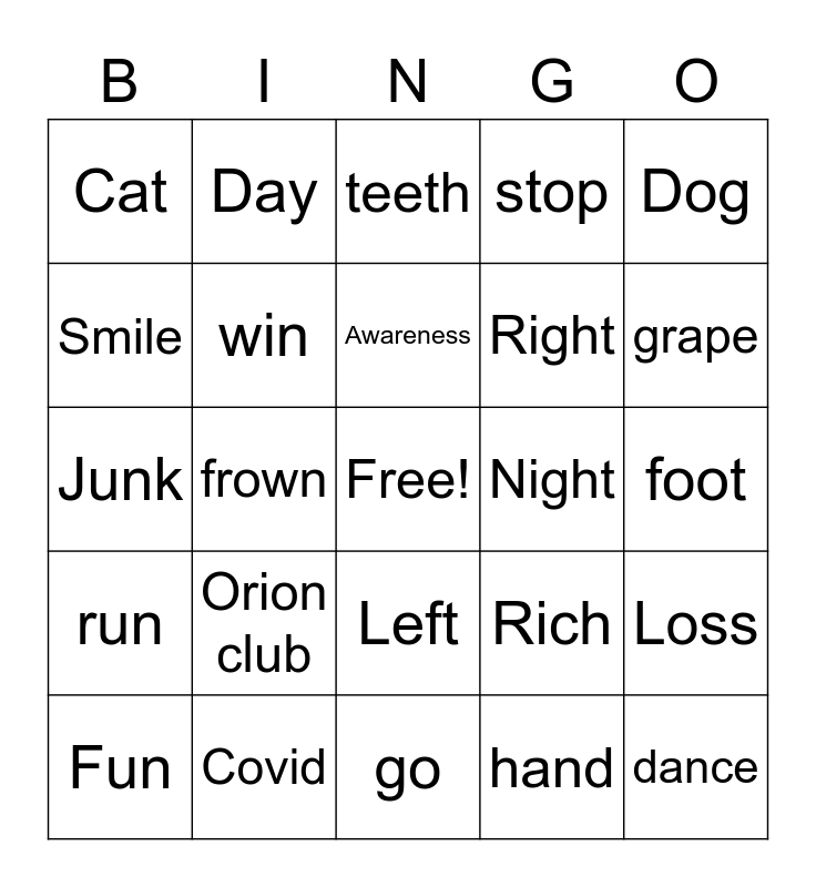 This bingo card has a free space and 24 words: Orion club, Covid, Awareness, Fun, Dog, Cat, Smile, Day, Night, Left, Right, Junk, Rich, Loss, win, hand, foot, teeth, grape, frown, dance, run, stop and go.