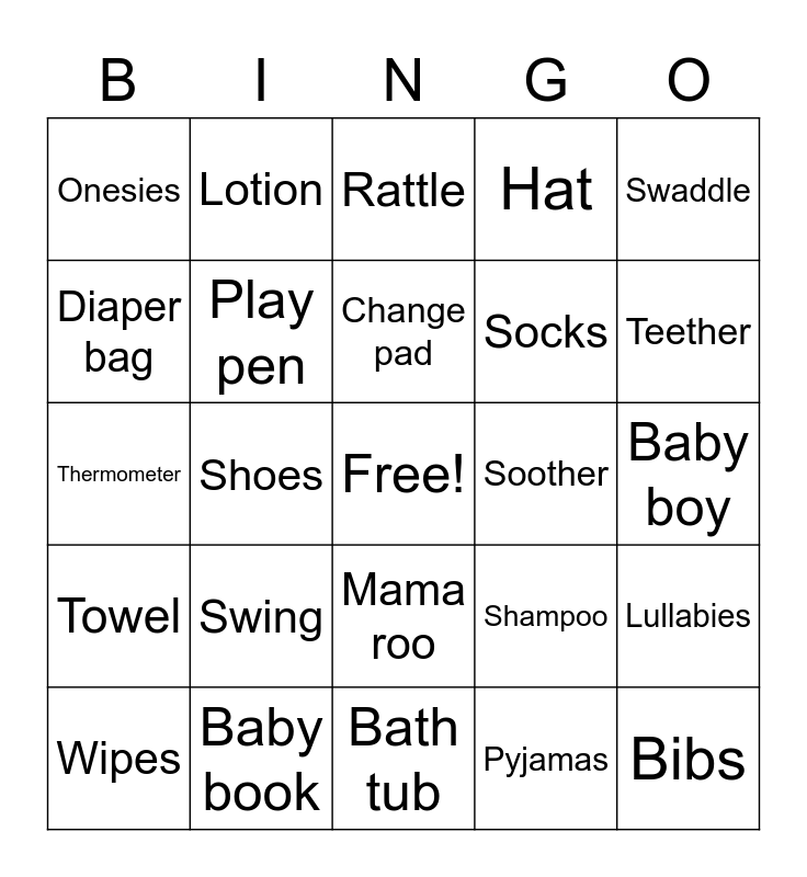 This bingo card has a free space and 56 words: Blanket, Wipes, Diapers, Onesies, Bath tub, Wash cloths, Play pen, Bottle, Socks, Books, Hat, Toys, Stuffed animals, Bassinet, Crib, Stroller, Swaddle, Shoes, Change table, Bibs, Soother, Burp cloth, Shampoo, Rattle, Car seat, Change pad, Nursery, Mittens, Teether, Jumperoo, Baby monitor, Night light, High chair, Baby girl, Baby boy, Diaper bag, Thermometer, Diaper pail, Towel, Lotion, Mama roo, Nursing pillow, Bouncer, Mobile, Baby powder, Swing, Baby book, Milk, Nap time, Crib sheet, Pyjamas, Diaper cream, Registry, Due date, Lullabies and April.