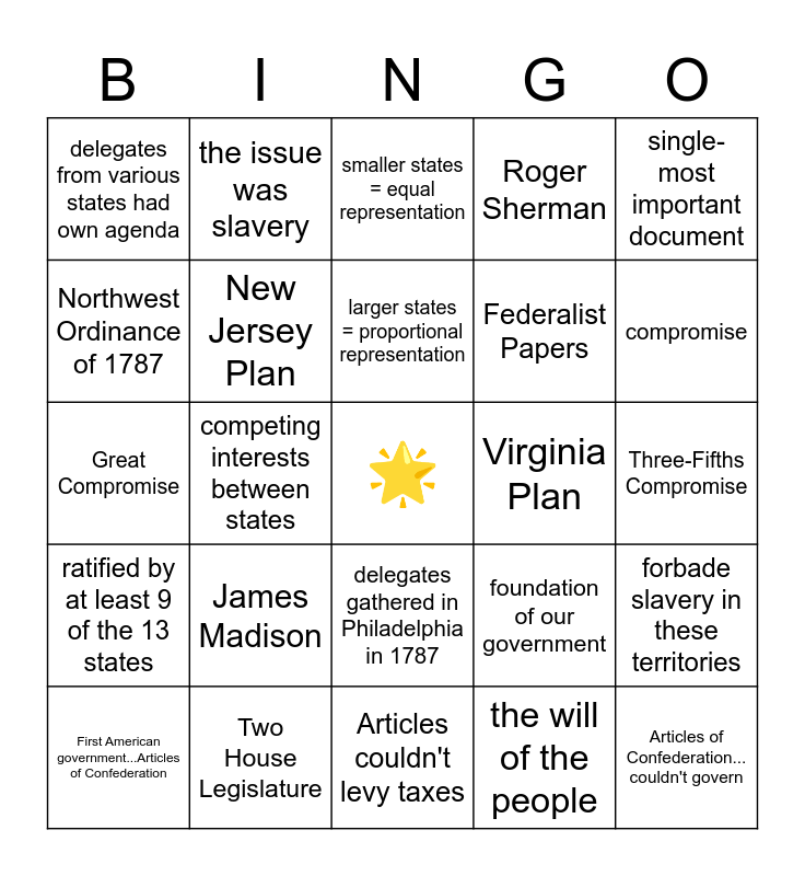 This bingo card has a free space and 24 words: James Madison, Two House Legislature, larger states = proportional representation, First American government...Articles of Confederation, single-most important document, delegates from various states had own agenda, Northwest Ordinance of 1787, the issue was slavery, Virginia Plan, delegates gathered in Philadelphia in 1787, Federalist Papers, Great Compromise, foundation of our government, forbade slavery in these territories, New Jersey Plan, the will of the people, Three-Fifths Compromise, smaller states = equal representation, compromise, competing interests between states, Articles of Confederation... couldn't govern, ratified by at least 9 of the 13 states, Roger Sherman and Articles couldn't levy taxes.