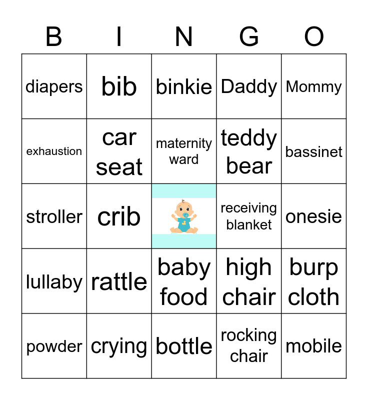 This bingo card has a free space and 29 words: powder, wipes, crib, booties, diapers, binkie, car seat, rattle, receiving blanket, crying, onesie, mobile, bottle, rocking chair, bassinet, naptime, baby food, lullaby, Mommy, stroller, high chair, layette, teddy bear, exhaustion, Daddy, bib, burp cloth, maternity ward and baptism.