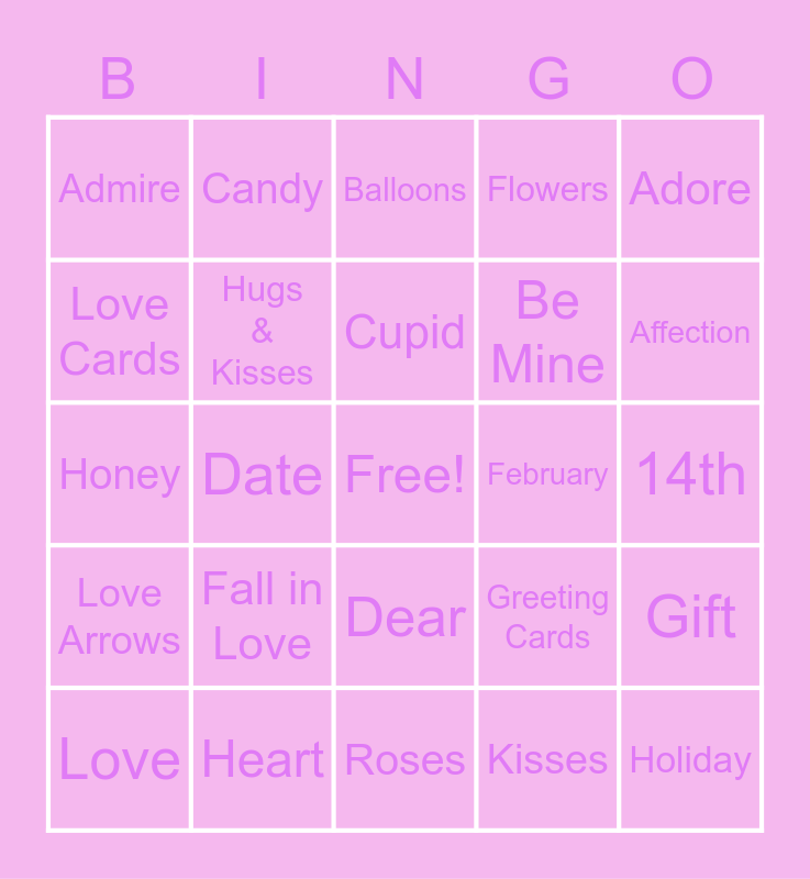 This bingo card has a free space and 24 words: Love, Fall in Love, Cupid, Kisses, Adore, Admire, Candy, Balloons, February, 14th, Honey, Hugs & Kisses, Greeting Cards, Gift, Love Cards, Heart, Roses, Flowers, Affection, Love Arrows, Date, Dear, Be Mine and Holiday.
