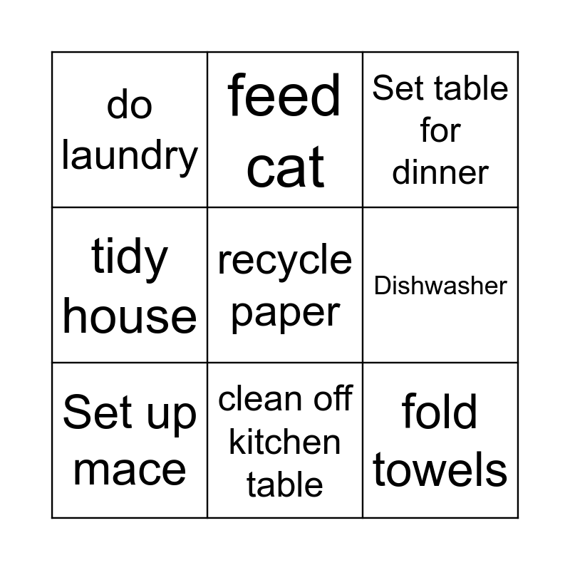 This bingo card has a free space and 8 words: Dishwasher, Set table for dinner, feed cat, Set up mace, do laundry, fold towels, tidy house and clean off kitchen table.