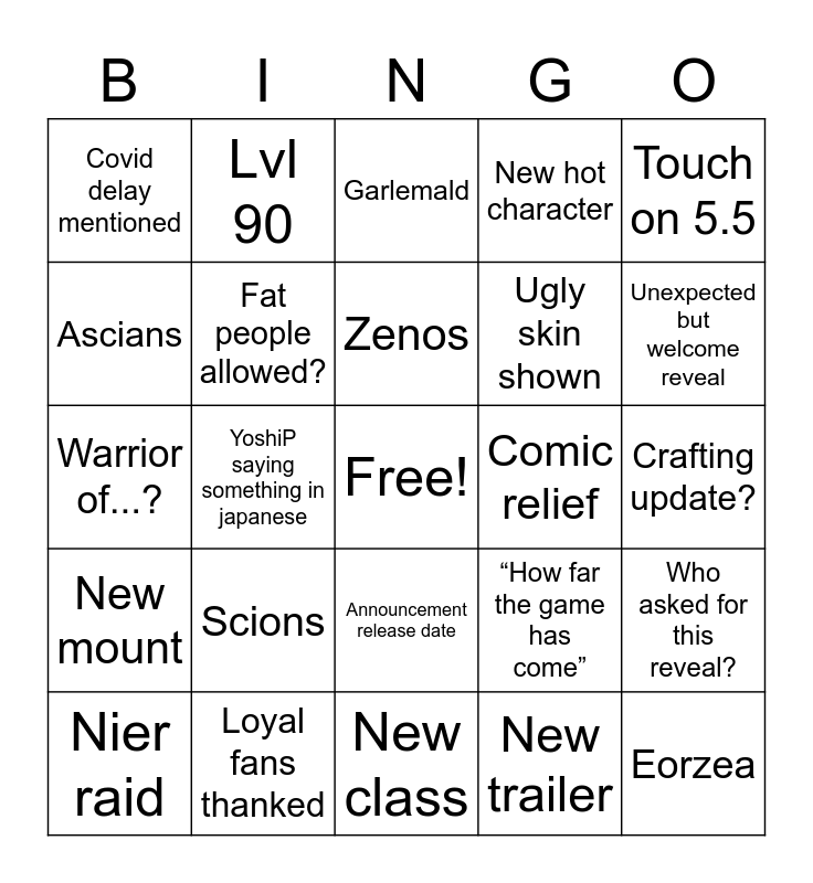 This bingo card has a free space and 24 words: Scions, Loyal fans thanked, Zenos, Nier raid, Touch on 5.5, Covid delay mentioned, Ascians, Lvl 90, Comic relief, Announcement release date, Ugly skin shown, Warrior of...?, “How far the game has come”, Who asked for this reveal?, Fat people allowed?, New trailer, Crafting update?, Garlemald, Unexpected but welcome reveal, YoshiP saying something in japanese, Eorzea, New mount, New hot character and New class.
