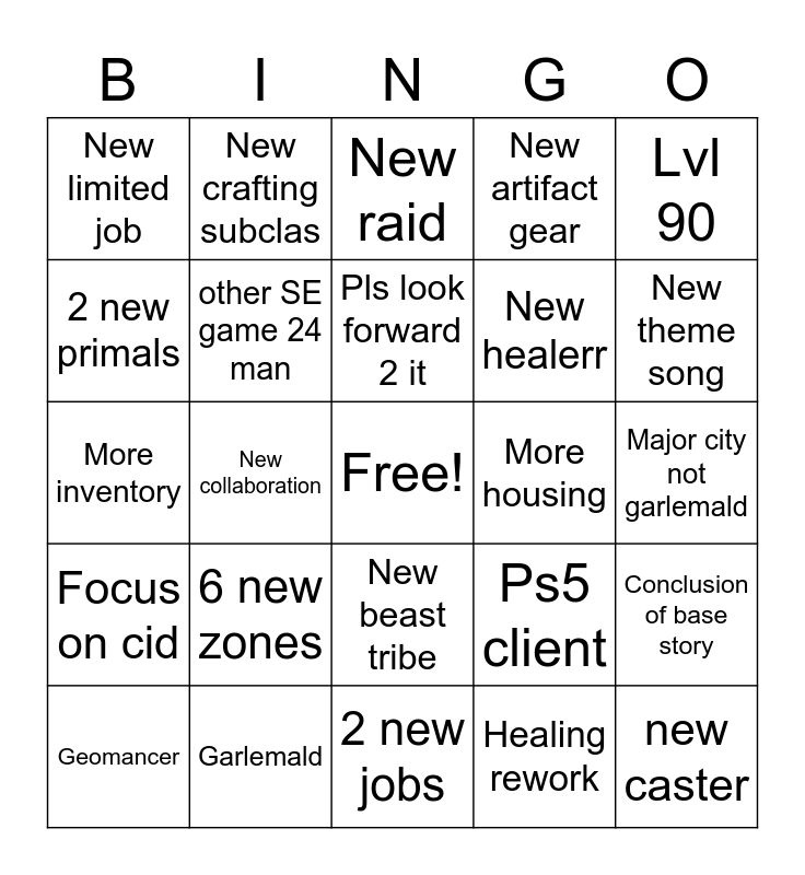 This bingo card has a free space and 24 words: 6 new zones, Garlemald, Pls look forward 2 it, Geomancer, Lvl 90, New limited job, 2 new primals, New crafting subclas, More housing, New beast tribe, New healerr, More inventory, Ps5 client, Conclusion of base story, other SE game 24 man, Healing rework, Major city not garlemald, New raid, New theme song, New collaboration, new caster, Focus on cid, New artifact gear and 2 new jobs.