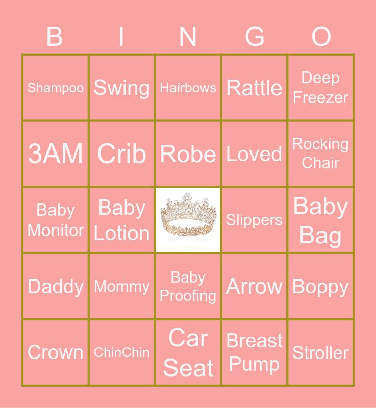 This bingo card has a free space and 29 words: Crown, Diaper, Baby Lotion, Onesie, Shampoo, Hairbows, Crib, Mommy, Slippers, ChinChin, Baby Bag, Stroller, Car Seat, Breast Pump, Rocking Chair, Wipes, Baby Proofing, Daddy, Deep Freezer, Baby Monitor, Arrow, Mittens, Loved, 3AM, Rattle, Swing, Boppy, Robe and Ointment.