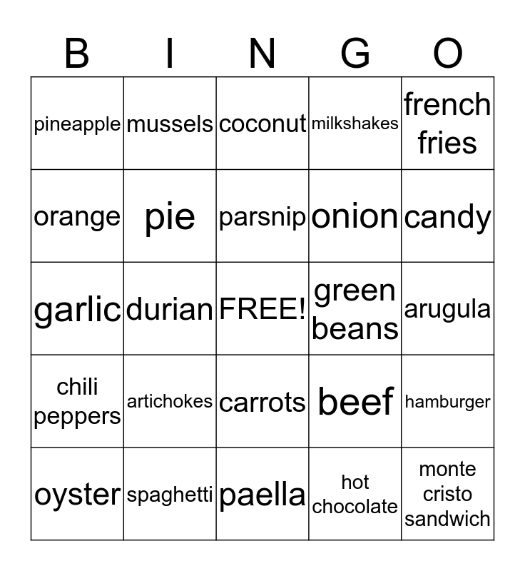 This bingo card has a free space and 24 words: artichokes, spaghetti, parsnip, oyster, french fries, pineapple, orange, mussels, green beans, carrots, onion, garlic, beef, hamburger, pie, hot chocolate, arugula, coconut, candy, durian, monte cristo sandwich, chili peppers, milkshakes and paella.