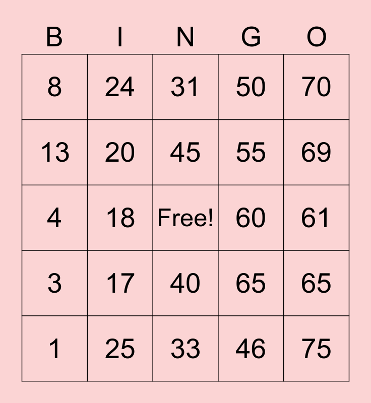 This bingo card has a free space and 24 words: 1, 17, 45, 46, 70, 8, 24, 31, 60, 61, 4, 20, 65, 65, 13, 25, 33, 50, 69, 3, 18, 40, 55 and 75.