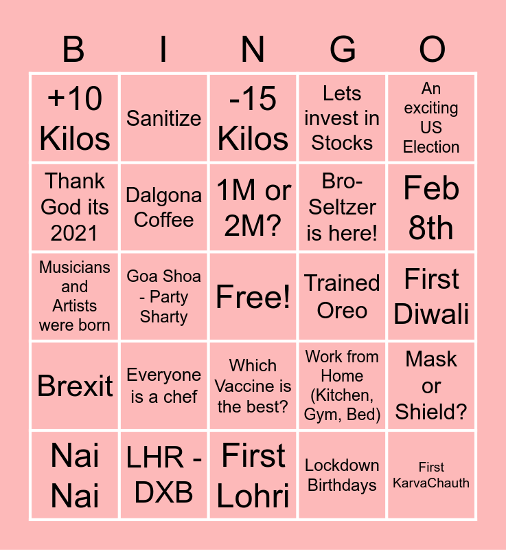 This bingo card has a free space and 29 words: Nai Nai, Welcome Home Oreo, Goa Shoa - Party Sharty, Tested Negative Feeling Positive, +10 Kilos, -15 Kilos, Dalgona Coffee, Everyone is a chef, Trained Oreo, LHR - DXB, First Diwali, First KarvaChauth, First Lohri, Lockdown Birthdays, Feb 8th, Lots of Clapping, Which Vaccine is the best?, Brexit, An exciting US Election, Musicians and Artists were born, Work from Home (Kitchen, Gym, Bed), Zoom Parties, Bro-Seltzer is here!, Thank God its 2021, Lets invest in Stocks, Sanitize, Mask or Shield?, 1M or 2M? and Did you take your Vitamins?.