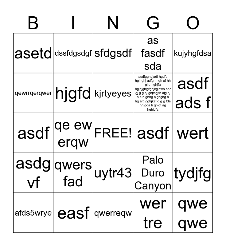 This bingo card has a free space and 27 words: Palo Duro Canyon, Texas, asdfgghgjadf hgdfs hgjhghj adfghh gh af hh gj q hghjfa hgjhjghjgfghjkgjhwh hhr gj g g aj ghjthgjth ajg hj h a h ghhg ajghghg h hg afg gghjkaf d g g fda hg gda h ghjdf ag hghjdfa, qwerreqw, qewrrqerqwer, sfdgsdf, dssfdgsdgf, asdg vf, asdf, tydjfg, asdf, as fasdf sda, afds5wrye, easf, asdf ads f, sf dg, hjgfd, kjrtyeyes, qwers fad, asetd, wert, wer tre, qe ew erqw, qwe qwe, uytr43, kujyhgfdsa and ,jhmngbv.