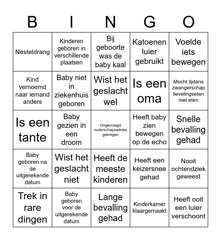 This bingo card has a free space and 24 words: Wist het geslacht niet, Baby geboren voor de uitgerekende datum, Wist het geslacht wel, Trek in rare dingen, Voelde iets bewegen, Nesteldrang, Kind vernoemd naar iemand anders, Kinderen geboren in verschillende plaatsen, Heeft baby zien bewegen op de echo, Heeft de meeste kinderen, Is een oma, Is een tante, Heeft een keizersnee gehad, Nooit ochtendziek geweest, Baby niet in ziekenhuis geboren, Kinderkamer klaargemaakt, Snelle bevalling gehad, Bij geboorte was de baby kaal, Mocht tijdens zwangerschap lievelingseten niet eten, Baby gezien in een droom, Heeft ooit een luier verschoont, Baby geboren na de uitgerekende datum, Katoenen luier gebruikt and Lange bevalling gehad.