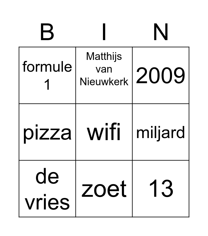 This bingo card has a free space and 8 words: miljard, 2009, Matthijs van Nieuwkerk, de vries, formule 1, 13, pizza and zoet.