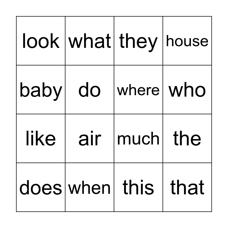 This bingo card has 16 words: when, the, they, look, like, what, much, this, baby, do, does, house, air, who, where and that.