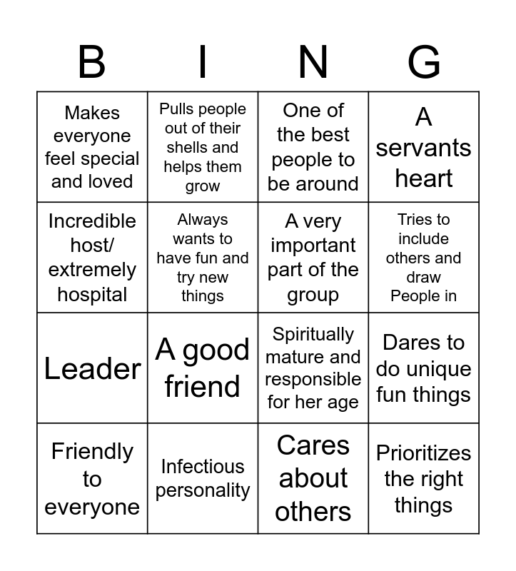This bingo card has 16 words: Infectious personality, Dares to do unique fun things, One of the best people to be around, Makes everyone feel special and loved, Leader, Pulls people out of their shells and helps them grow, Spiritually mature and responsible for her age, Cares about others, Incredible host/ extremely hospital, Always wants to have fun and try new things, Friendly to everyone, A servants heart, A good friend, Tries to include others and draw People in, A very important part of the group and Prioritizes the right things.