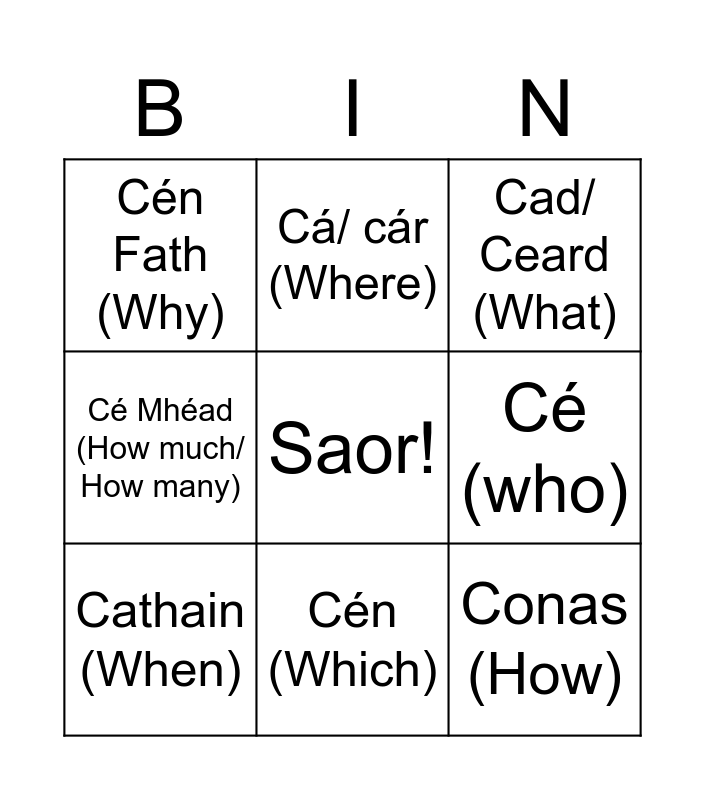 This bingo card has a free space and 8 words: Cé (who), Cad/ Ceard (What), Cá/ cár (Where), Cathain (When), Cén Fath (Why), Conas (How), Cé Mhéad (How much/ How many) and Cén (Which).
