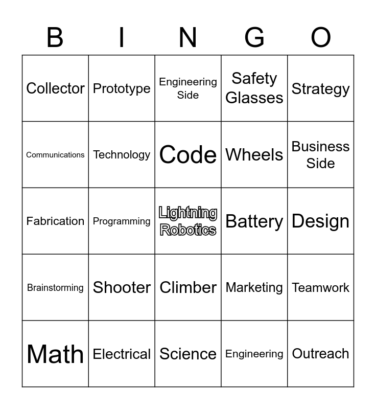 This bingo card has a free space and 24 words: Shooter, Electrical, Code, Math, Strategy, Collector, Communications, Prototype, Battery, Climber, Wheels, Fabrication, Marketing, Teamwork, Technology, Engineering, Design, Engineering Side, Business Side, Programming, Outreach, Brainstorming, Safety Glasses and Science.