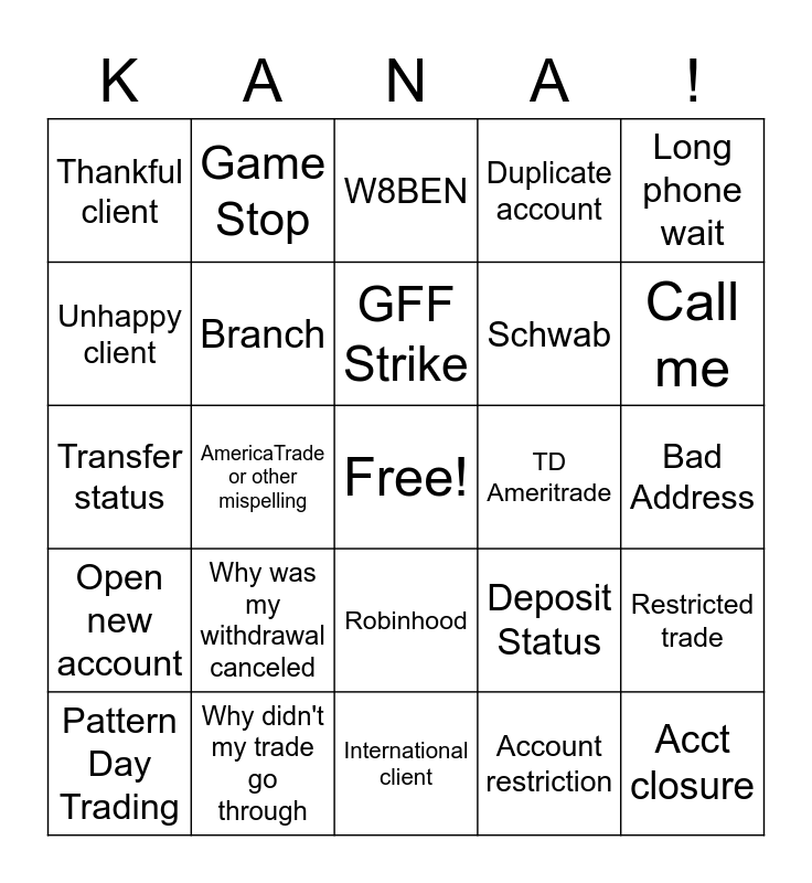 This bingo card has a free space and 24 words: Why was my withdrawal canceled, Why didn't my trade go through, GFF Strike, Pattern Day Trading, Long phone wait, Thankful client, Unhappy client, Game Stop, TD Ameritrade, Robinhood, Schwab, Transfer status, Deposit Status, Restricted trade, Branch, Account restriction, Bad Address, W8BEN, Call me, AmericaTrade or other mispelling, Acct closure, Open new account, Duplicate account and International client.