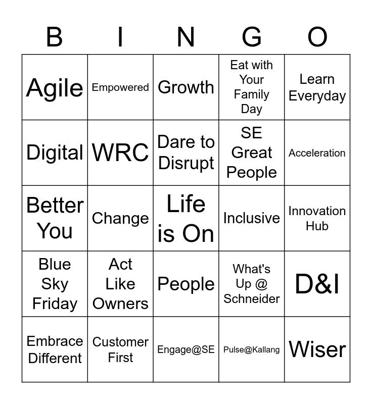 This bingo card has a free space and 24 words: Act Like Owners, Customer First, Dare to Disrupt, Embrace Different, Learn Everyday, Agile, Digital, Empowered, Inclusive, People, SE Great People, Better You, What's Up @ Schneider, D&I, WRC, Pulse@Kallang, Innovation Hub, Growth, Acceleration, Change, Wiser, Blue Sky Friday, Eat with Your Family Day and Engage@SE.