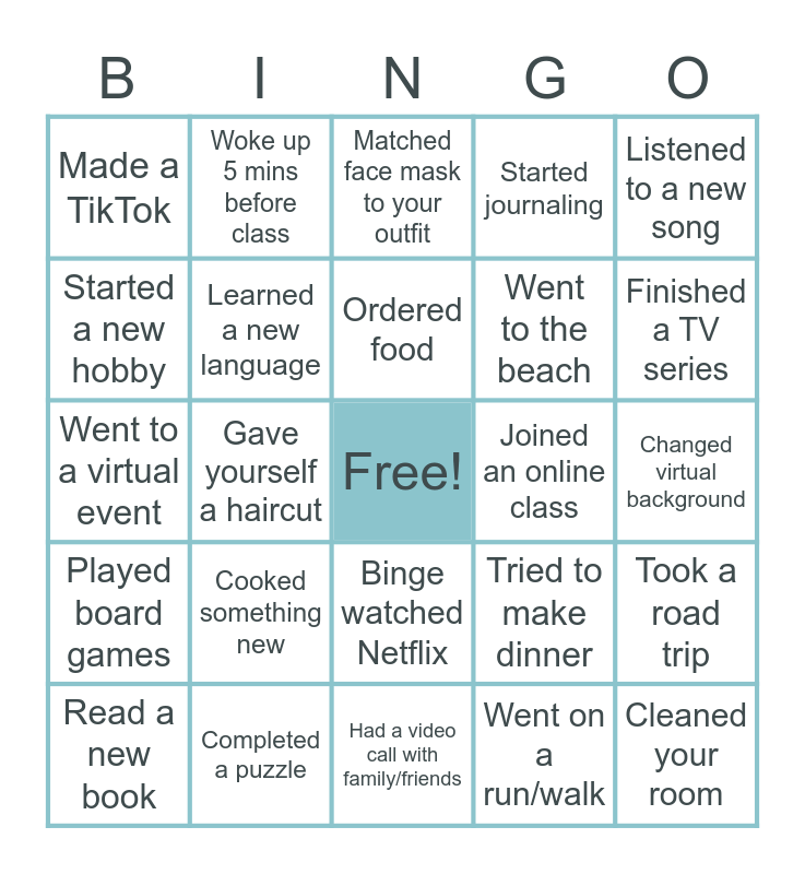 This bingo card has a free space and 30 words: Completed a puzzle, Took a bath, Gave yourself a haircut, Wore pj's all day, Made a TikTok, Matched face mask to your outfit, Learned a new language, Binge watched Netflix, Joined an online class, Had a video call with family/friends, Changed virtual background, Cleaned your room, Went on a run/walk, Played a new video game, Finished a TV series, Played card games, Tried to make dinner, Played board games, Cooked something new, Listened to a new song, Went to a virtual event, Wrote a letter to a friend, Woke up 5 mins before class, Went to the beach, Started a new hobby, Started journaling, Took a road trip, Read a new book, Ordered food and Tried a new sport.