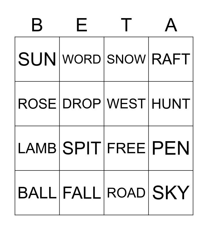 This bingo card has 28 words: DUCK, LAMP, LAMB, BIRD, DROP, SNOW, WORD, SKY, FALL, TREE, FREE, RAFT, LAKE, HIKE, SPIT, EAST, LEAF, WEST, HUNT, DEER, SUN, MOON, BALL, PEN, ROAD, TOAD, ROSE and CROW.