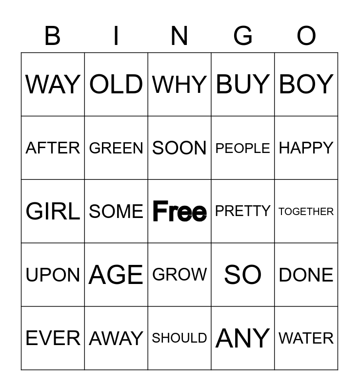 This bingo card has a free space and 30 words: AWAY, NOW, SOME, TODAY, WAY, WHY, GREEN, GROW, PRETTY, SHOULD, TOGETHER, WATER, ANY, FROM, HAPPY, ONCE, SO, UPON, AGE, BOY, GIRL, HOW, OLD, PEOPLE, AFTER, BUY, DONE, EVER, SOON and WORK.