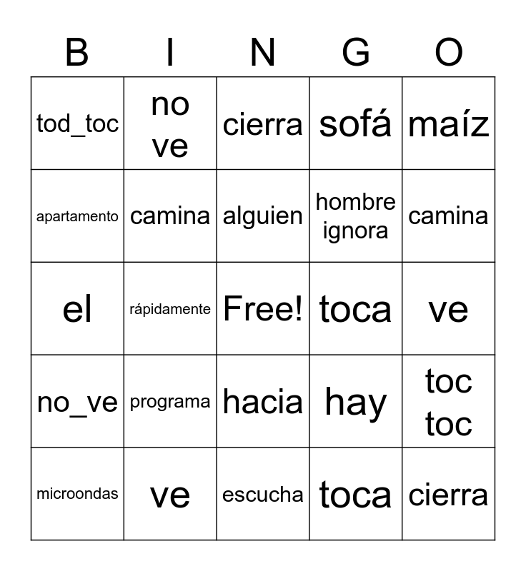This bingo card has a free space and 39 words: apartamento, escucha, hombre_ignora, camina, microondas, hacia, alguien, sale, maíz, no_ve, rápidamente, sofá, cierra, ve, toca, programa, misteriosamente, tod_toc, el, hay, apartamento, escucha, hombre ignora, camina, microondas, hacia, alguien, sale, maíz, no ve, rápidamente, sofá, cierra, ve, toca, misteriosamente, toc toc, el and hay.