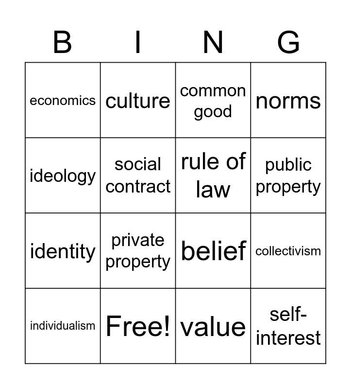 This bingo card has 16 words: Free!, collectivism, common good, economics, identity, culture, belief, value, ideology, social contract, individualism, norms, private property, public property, rule of law and self-interest.