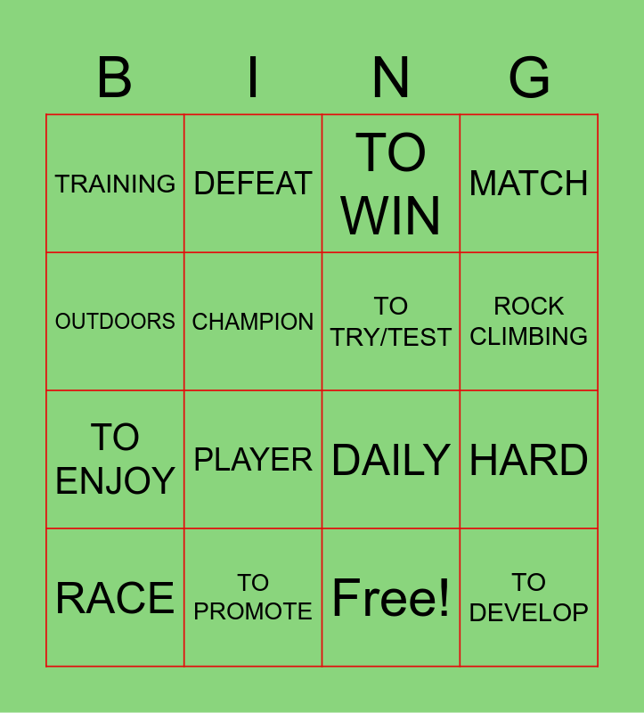 This bingo card has 17 words: Free!, RACE, TO WIN, TRAINING, PLAYER, MATCH, HARD, TO TRY/TEST, ROCK CLIMBING, CHAMPION, TO PROMOTE, DAILY, OUTDOORS, DEFEAT, TO ENJOY, EFFORT and TO DEVELOP.