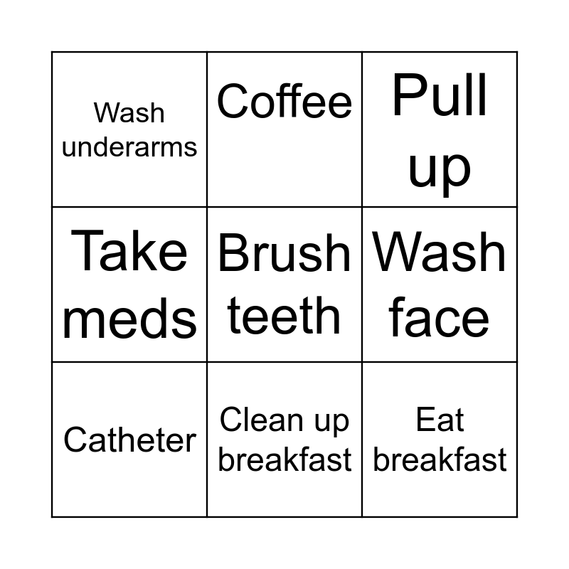 This bingo card has 9 words: Catheter, Pull up, Coffee, Take meds, Wash underarms, Wash face, Brush teeth, Eat breakfast and Clean up breakfast.