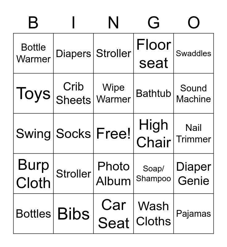 This bingo card has a free space and 29 words: Bottles, Pacifies, Socks, Onsie, Bottle Warmer, Stroller, Crib Sheets, Stroller, High Chair, Bibs, Nail Trimmer, Pajamas, Car Seat, Wash Cloths, Sound Machine, Blanket, Photo Album, Burp Cloth, Swaddles, Swing, Soap/ Shampoo, Monitor, Bathtub, Toys, Floor seat, Diapers, Diaper Genie, Wipe Warmer and Carrier.