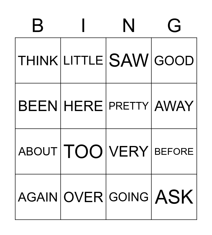 This bingo card has 27 words: BOTH, DOES, ABOUT, OLD, HERE, SAW, LITTLE, ASK, OVER, LONG, VERY, GOOD, AROUND, KNOW, TOO, EVERY, PRETTY, AWAY, AFTER, THINK, GOING, WALK, BEFORE, AGAIN, WHO, BEEN and GOES.