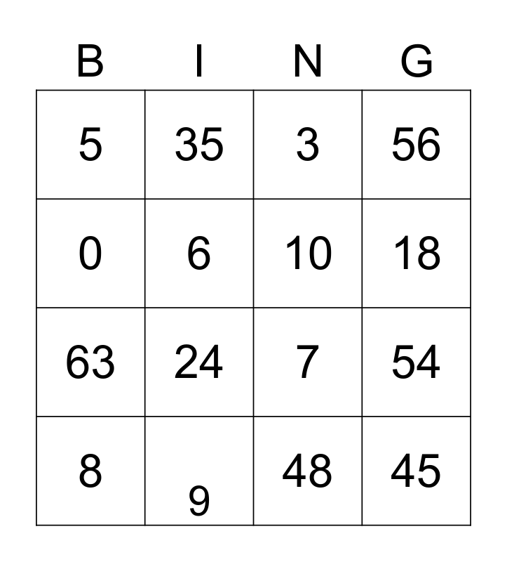This bingo card has 16 words: 9, 54, 3, 5, 63, 35, 7, 48, 0, 6, 8, 56, 24, 18, 10 and 45.