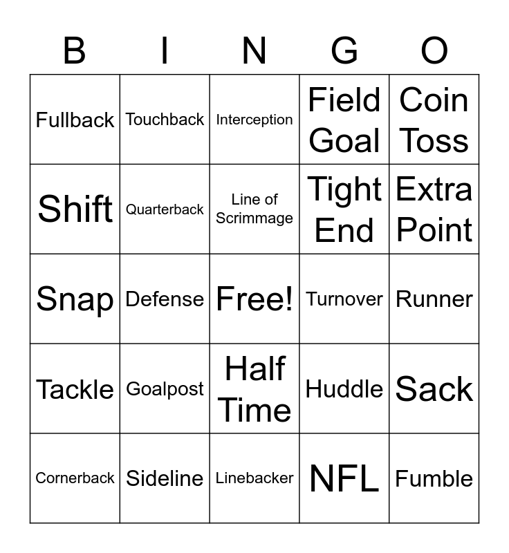 This bingo card has a free space and 56 words: Center, Cornerback, Defensive End, Fullback, Linebacker, Punter, Quarterback, Running Back, Tight End, Receiver, Field Goal, Touchdown, 2 Pt Conversion, Offside, Penalty, Catch, Coin Toss, Defense, Down, Fumble, Turnover, Handoff, Huddle, Interception, Kickoff, Line of Scrimmage, Loose ball, Offense, Extra Point, Officials, Out of bounds, Pitch, Possession, Punt, Runner, Shift, Snap, Substitution, Tackle, Touchback, Half Time, Quarters, Timeout, Two Minute Warning, End Zone, Goalpost, Sideline, Yards, Football, Commercial, NFL, Stadium, Incompletion, Red Zone, Sack and Rushing.