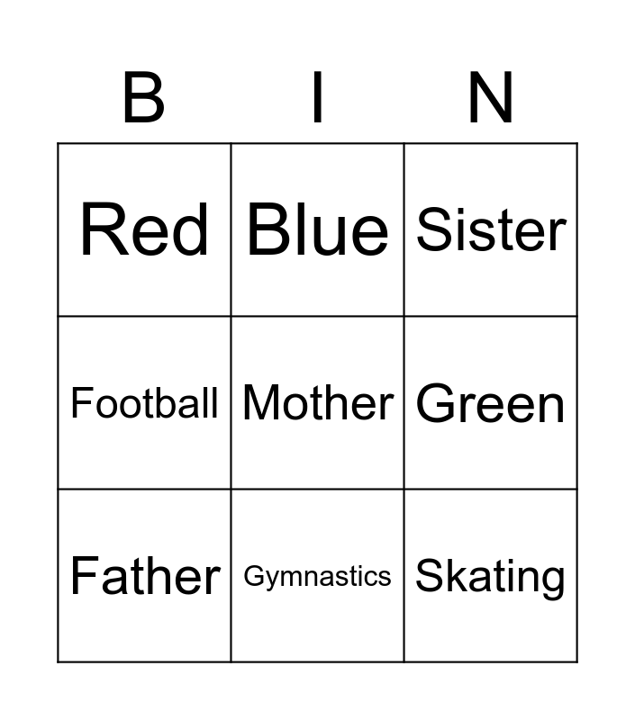 This bingo card has 9 words: Father, Mother, Sister, Red, Blue, Green, Football, Gymnastics and Skating.