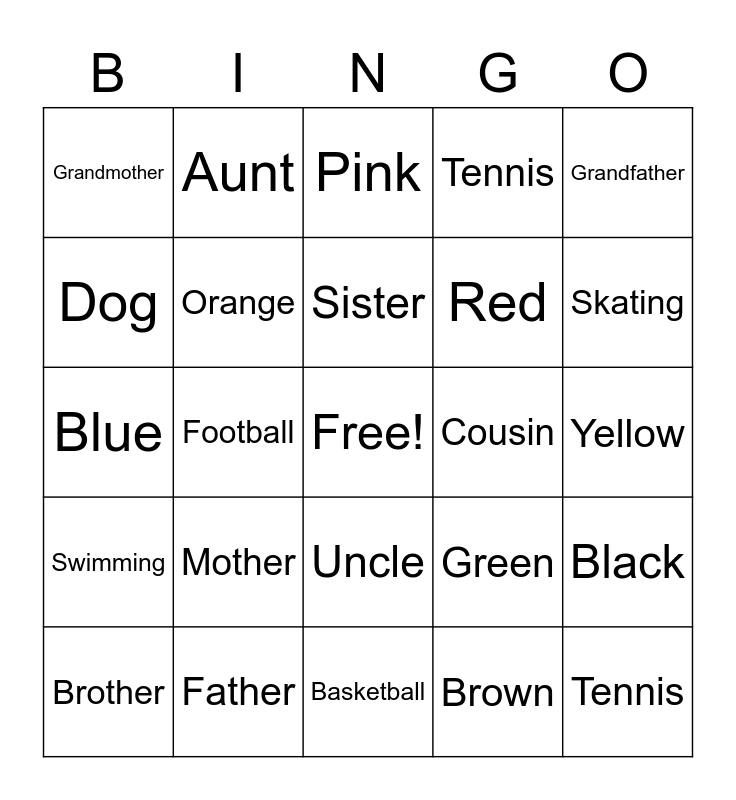 This bingo card has a free space and 24 words: Mother, Father, Sister, Brother, Grandfather, Grandmother, Dog, Aunt, Cousin, Uncle, Red, Blue, Green, Black, Orange, Brown, Yellow, Pink, Skating, Football, Tennis, Swimming, Tennis and Basketball.