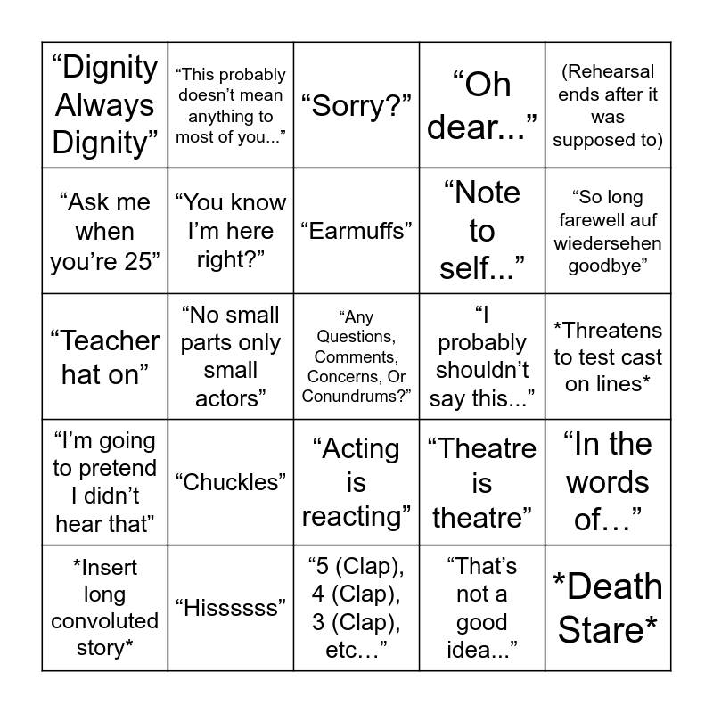 This bingo card has a free space and 25 words: “Chuckles”, “5 (Clap), 4 (Clap), 3 (Clap), etc…”, “Earmuffs”, *Insert long convoluted story*, (Rehearsal ends after it was supposed to), “Dignity Always Dignity”, “Ask me when you’re 25”, “This probably doesn’t mean anything to most of you...”, “I probably shouldn’t say this...”, “Acting is reacting”, “Note to self...”, “Teacher hat on”, “Theatre is theatre”, “In the words of…”, “You know I’m here right?”, “I worry...”, *Threatens to test cast on lines*, “Sorry?”, “So long farewell auf wiedersehen goodbye”, “No small parts only small actors”, *Death Stare*, “Hissssss”, “I’m going to pretend I didn’t hear that”, “Oh dear...” and “That’s not a good idea...”.