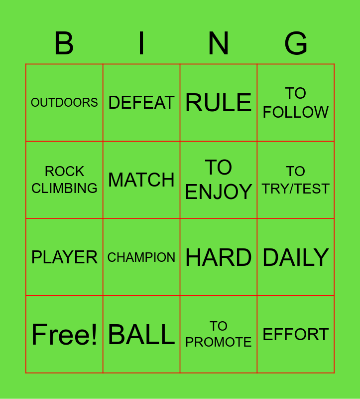 This bingo card has 17 words: Free!, BALL, RULE, TO FOLLOW, PLAYER, MATCH, HARD, TO TRY/TEST, ROCK CLIMBING, CHAMPION, TO PROMOTE, DAILY, OUTDOORS, DEFEAT, TO ENJOY, EFFORT and TO DEVELOP.