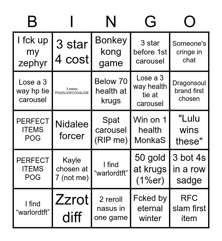 This bingo card has 72 words: Fast samira into 8th, 3 star 4 cost, Nidalee forcer, Guy ffs above before chickens, Fcked by eternal winter, sunfire/warmogs at chickens YEP, 3 star before 1st carousel, 4 warlord players in 1 game, Lose a 3 way health tie at carousel, FUCKASS Rakan, I find “warlordtft”, RFC slam, Dragonsoul brand first chosen, I fck up my zephyr, I get natural 3 cost 2 star b4 3-3, PERFECT ITEMS POG, 50 gold at krugs (1%er), Someone's cringe in chat, Big brain positioning, "Lulu wins these", Kayle chosen at 7 (not me), Spat carousel (RIP me), 3 bot 4s in a row sadge, Win on 1 health MonkaS, Fast 8 to fast 8th, Bonkey kong game, Fast samira into 8th, Below 70 health at krugs, I grab wrong unit at carousel, Gold collector/rocket fist smh, Zzrot diff, 3 star 4 cost, Nidalee forcer (not shweet), Guy ffs before chickens, Fcked by eternal winter, sunfire/warmogs at chickens YEP, 3 star before 1st carousel, 4 warlord players in 1 game, Lose a 3 way hp tie carousel, Fckass Rakan, I find “warlordtft”, RFC slam first item, Dragonsoul brand first chosen, I fck up my zephyr, I get natural 3 cost 2 star b4 3-3, PERFECT ITEMS POG, 50 gold at krugs (1%er), Someones cringe in chat, Big brain positioning, “Lulu wins these”, Kayle chosen at 7 (not shweet), Spat carousel (RIP shweet), 3 bot 4s in a row sadge, Win on 1 health MonkaS, Fast 8 to fast 8th, Fast samira into 8th, Bonkey kong game, Below 70 health at krugs, I grab wrong unit at carousel, Gold collector/rocket fist smh, Zzrot diff, Sett??????, I get Samira at 4-4 carousel, 2 reroll nasus in one game, Shroud diff, Shweet gets hard griefed, 3 zekes POGSLIDECOGSLIDE, Loses to PvE, Lose placing by 1 hp, Perfect death (0 hp), Demote with a 5th and Belt start :,(.