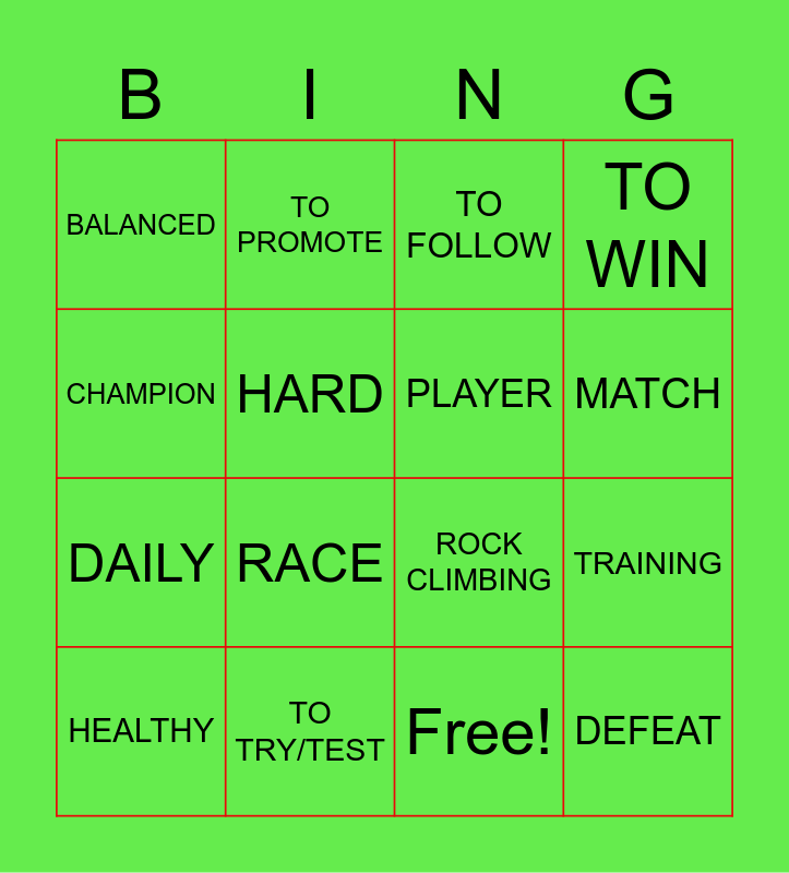 This bingo card has 17 words: Free!, HEALTHY, TO FOLLOW, BALANCED, RACE, TO WIN, TRAINING, PLAYER, MATCH, HARD, TO TRY/TEST, ROCK CLIMBING, CHAMPION, TO PROMOTE, DAILY, OUTDOORS and DEFEAT.