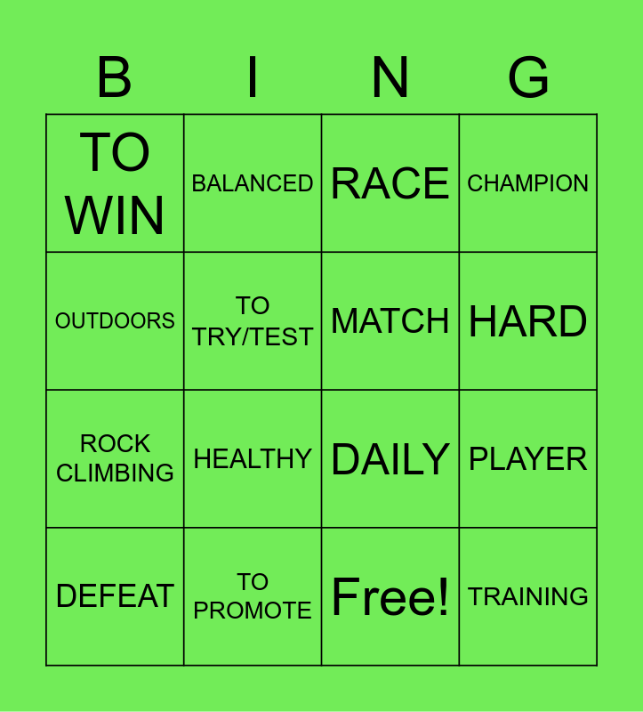 This bingo card has 17 words: Free!, DEFEAT, RACE, TO WIN, HEALTHY, CHAMPION, PLAYER, MATCH, HARD, TO TRY/TEST, TO PROMOTE, DAILY, OUTDOORS, BALANCED, ROCK CLIMBING, TO FOLLOW and TRAINING.