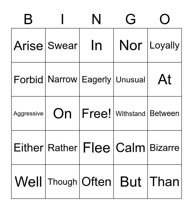 This bingo card has a free space and 25 words: Rather, Often, Eagerly, Well, Loyally, Arise, Forbid, Swear, Withstand, Flee, Unusual, Aggressive, Calm, Bizarre, Narrow, Among, Between, In, At, On, Than, Though, Either, Nor and But.