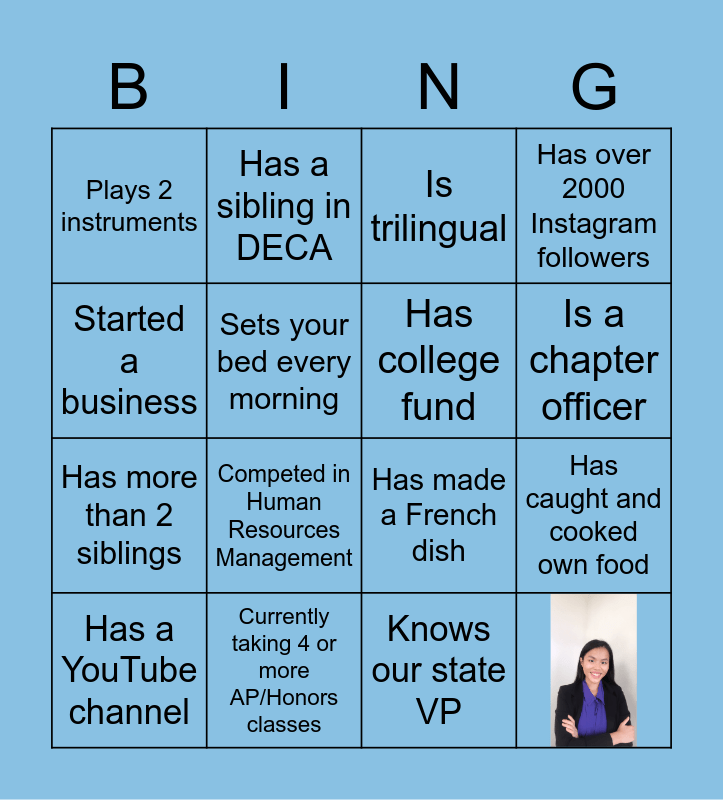 This bingo card has 1 images and 15 words: Currently taking 4 or more AP/Honors classes, Has caught and cooked own food, Is trilingual, Plays 2 instruments, Has more than 2 siblings, Has a sibling in DECA, Has made a French dish, Knows our state VP, Started a business, Sets your bed every morning, Has a YouTube channel, Has over 2000 Instagram followers, Competed in Human Resources Management, Is a chapter officer and Has college fund.