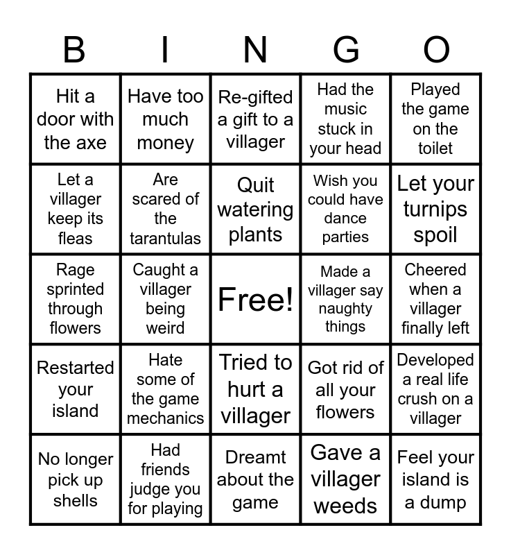 This bingo card has a free space and 24 words: Hate some of the game mechanics, Had friends judge you for playing, Quit watering plants, No longer pick up shells, Played the game on the toilet, Hit a door with the axe, Let a villager keep its fleas, Have too much money, Made a villager say naughty things, Tried to hurt a villager, Wish you could have dance parties, Rage sprinted through flowers, Got rid of all your flowers, Developed a real life crush on a villager, Are scared of the tarantulas, Gave a villager weeds, Cheered when a villager finally left, Re-gifted a gift to a villager, Let your turnips spoil, Caught a villager being weird, Feel your island is a dump, Restarted your island, Had the music stuck in your head and Dreamt about the game.