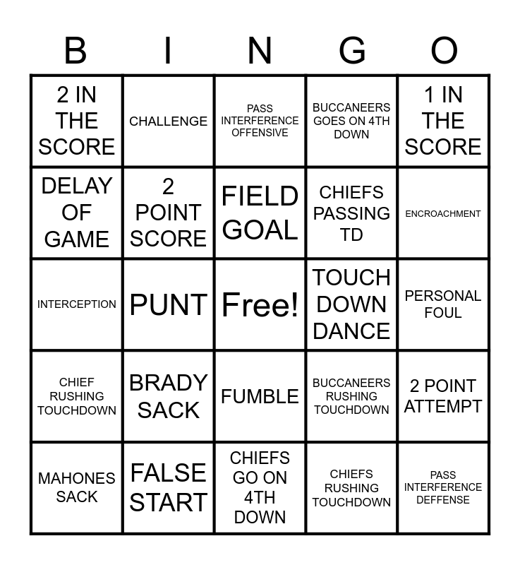 This bingo card has a free space and 24 words: BRADY SACK, FALSE START, FIELD GOAL, MAHONES SACK, 1 IN THE SCORE, 2 IN THE SCORE, DELAY OF GAME, CHALLENGE, TOUCH DOWN DANCE, FUMBLE, CHIEFS PASSING TD, INTERCEPTION, BUCCANEERS RUSHING TOUCHDOWN, 2 POINT ATTEMPT, 2 POINT SCORE, CHIEFS RUSHING TOUCHDOWN, PERSONAL FOUL, PASS INTERFERENCE OFFENSIVE, ENCROACHMENT, PUNT, PASS INTERFERENCE DEFFENSE, CHIEF RUSHING TOUCHDOWN, BUCCANEERS GOES ON 4TH DOWN and CHIEFS GO ON 4TH DOWN.