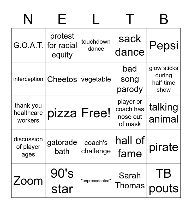This bingo card has a free space and 29 words: Zoom, discussion of commercials we will not see, pizza, Bill Belichick, G.O.A.T., touchdown dance, Cheetos, gatorade bath, player or coach has nose out of mask, 90's star, talking animal, TB pouts, "unprecedented", Sarah Thomas, glow sticks during half-time show, self-righteous fake patriotism, coach's challenge, discussion of player ages, Pepsi, thank you healthcare workers, hall of fame, QB draft position, bad song parody, interception, sack dance, protest for racial equity, pirate, vegetable and indigenous person.