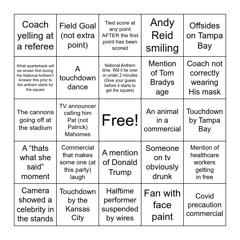 This bingo card has a free space and 24 words: Commercial that makes some one (at this party) laugh, Touchdown by the Kansas City, National Anthem time. Will it be over or under 2 minutes (Give your guess before it starts to get the square), Camera showed a celebrity in the stands, Offsides on Tampa Bay, Coach yelling at a referee, What quarterback will be shown first during the National Anthem? Answer this prior to the anthem starts for the square, Field Goal (not extra point), An animal in a commercial, A mention of Donald Trump, Mention of Tom Bradys age, The cannons going off at the stadium, Someone on tv obviously drunk, Mention of healthcare workers getting in free, A touchdown dance, Fan with face paint, Touchdown by Tampa Bay, Tied score at any point AFTER the first point has been scored, Coach not correctly wearing His mask, TV announcer calling him Pat (not Patrick) Mahomes, Covid precaution commercial, A “thats what she said” moment, Andy Reid smiling and Halftime performer suspended by wires.