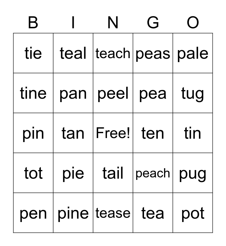 This bingo card has a free space and 24 words: pie, pine, peel, pen, pale, tie, tine, teal, ten, tail, pea, pin, peach, pug, pan, tea, tin, teach, tug, tan, pot, tot, peas and tease.