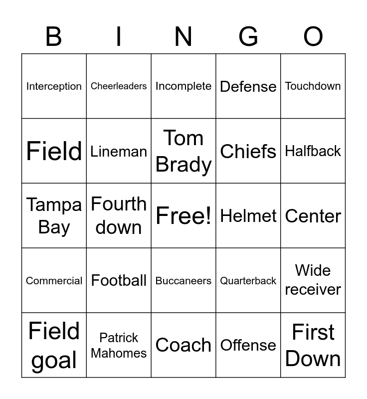This bingo card has a free space and 24 words: Football, Patrick Mahomes, Tom Brady, Field goal, Touchdown, Interception, Field, Cheerleaders, Helmet, Buccaneers, Chiefs, Tampa Bay, Quarterback, Wide receiver, Lineman, Offense, Center, Incomplete, Halfback, Fourth down, First Down, Commercial, Defense and Coach.