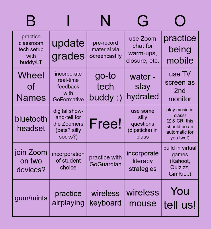This bingo card has a free space and 24 words: gum/mints, incorporation of student choice, go-to tech buddy :), wireless mouse, practice being mobile, practice classroom tech setup with buddy/LT, update grades, pre-record material via Screencastify, use some silly questions (dipsticks) in class, play music in class! (Z & CR, this should be an automatic for you two!), bluetooth headset, incorporate real-time feedback with GoFormative, incorporate literacy strategies, build in virtual games (Kahoot, Quizizz, GimKit...), Wheel of Names, practice airplaying, wireless keyboard, use Zoom chat for warm-ups, closure, etc., use TV screen as 2nd monitor, join Zoom on two devices?, digital show-and-tell for the Zoomers (pets? silly socks?), practice with GoGuardian, water - stay hydrated and You tell us!.
