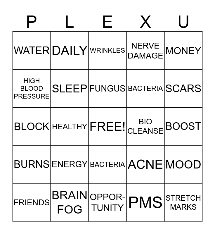 This bingo card has a free space and 24 words: ENERGY, BRAIN FOG, FUNGUS, FRIENDS, MONEY, WATER, HIGH BLOOD PRESSURE, DAILY, BIO CLEANSE, BACTERIA, BACTERIA, BLOCK, ACNE, MOOD, SLEEP, PMS, BOOST, WRINKLES, SCARS, HEALTHY, STRETCH MARKS, BURNS, NERVE DAMAGE and OPPOR-TUNITY.