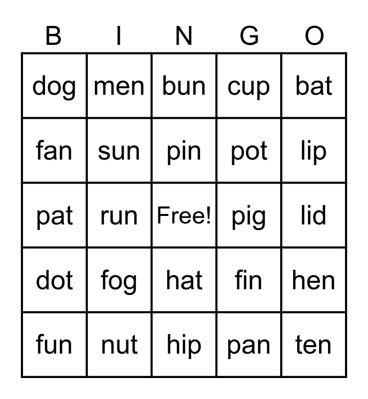 This bingo card has a free space and 24 words: fog, nut, pin, fun, bat, dog, fan, men, pig, hat, pot, pat, fin, hen, sun, pan, lid, bun, lip, run, ten, dot, cup and hip.